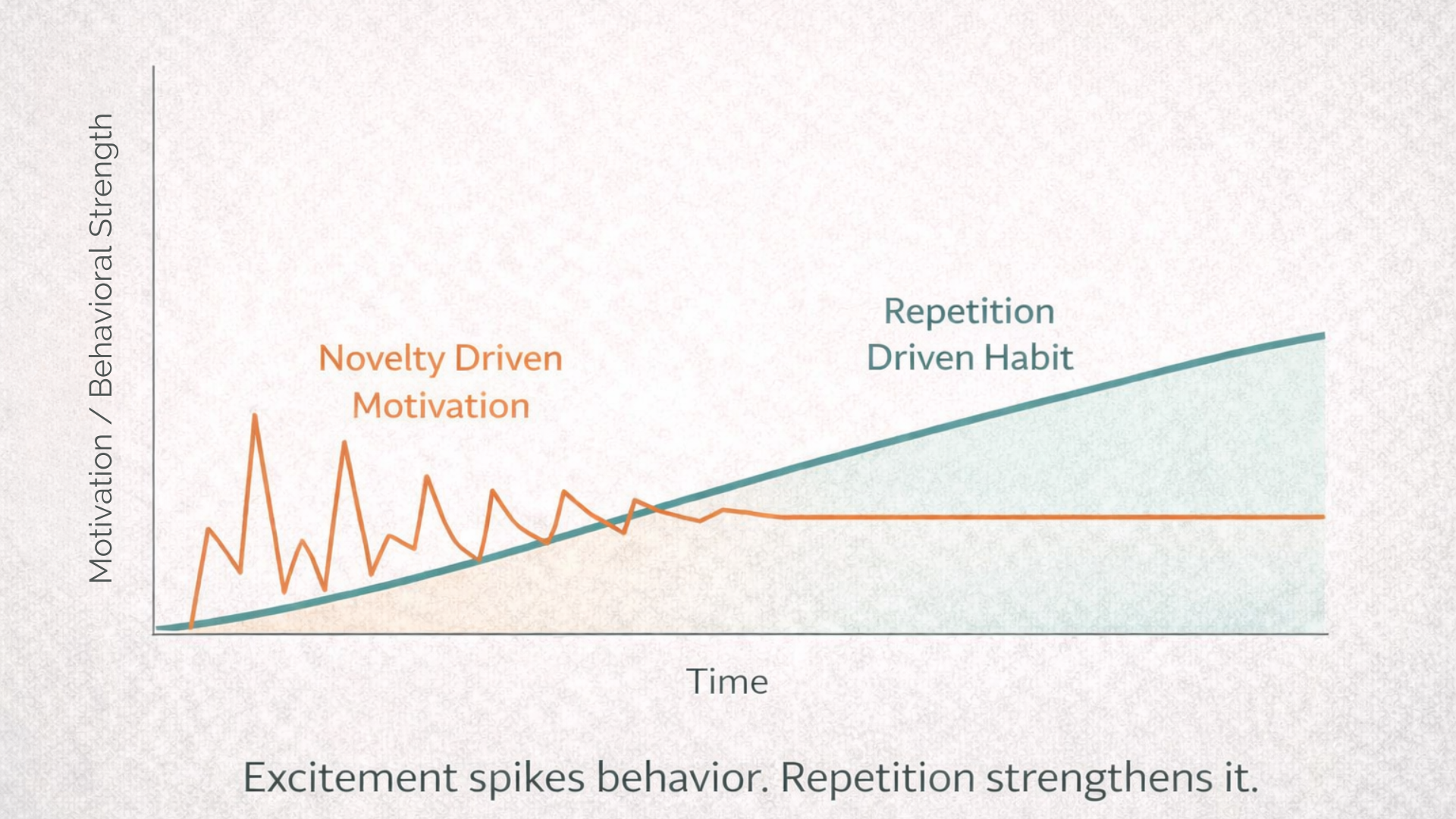 Motivation is an unreliable driver of behavior because it is tied to dopamine spikes. Dopamine increases with novelty, excitement, and urgency, then drops once the stimulus becomes familiar.