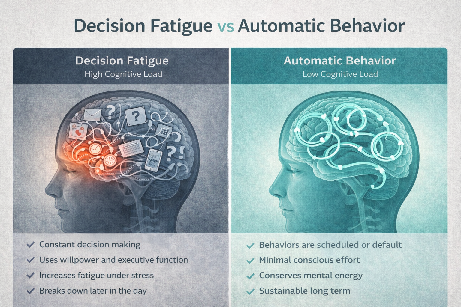 Tracking is not debated. Training is scheduled. Eating structure exists regardless of mood. This reduces cognitive load and shifts behaviors from the prefrontal cortex (effort) to automatic processing (habit).